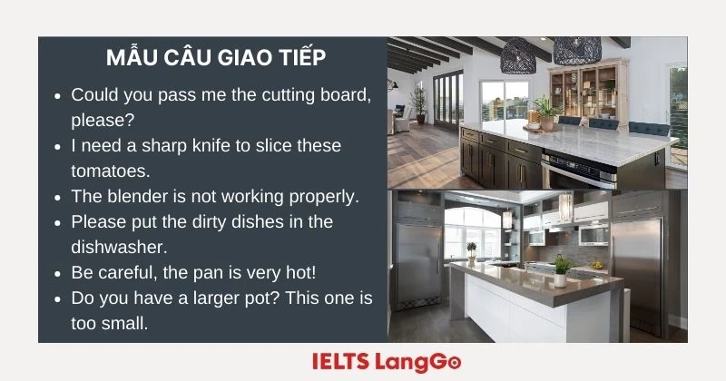 Để ghi nhớ các từ vựng đã học, các bạn nên áp dụng vào các mẫu câu giao tiếp chủ đề nhà bếp thực tế sau: