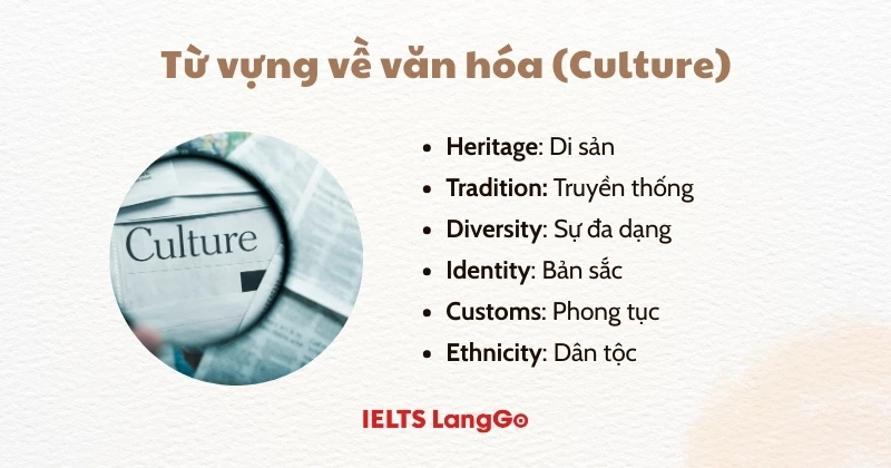 | Folklore | /ˈfəʊk.lɔːr/ | Văn hóa dân gian | Folklore includes stories passed down through generations. (Văn hóa dân gian bao gồm những câu chuyện được truyền qua nhiều thế hệ.) |