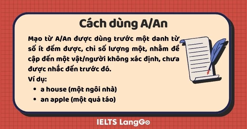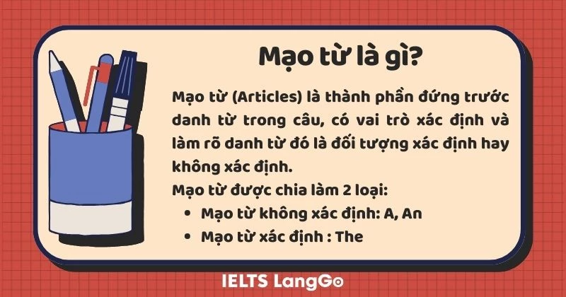 Trong bài viết này, IELTS LangGo sẽ cùng bạn tìm hiểu cách dùng mạo từ A, An, The cũng như các lỗi thường gặp kèm ví dụ cụ thể và bài tập thực hành giúp bạn hiểu rõ, ghi nhớ và sử dụng một cách chính xác.