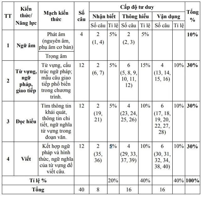Bảng năng lực và cấp độ tư duy đề thi vào lớp 10 môn Tiếng Anh TPHCM 2025