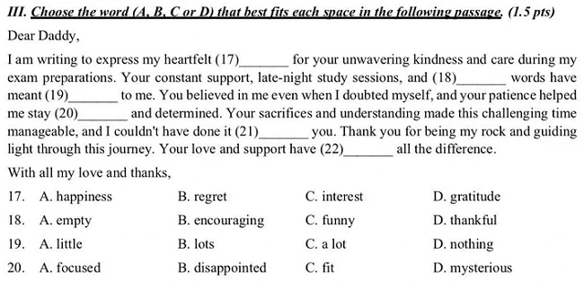 Phần 2 (3,0 điểm): Từ câu 5 đến câu 16, kiểm tra từ vựng, ngữ pháp, giao tiếp