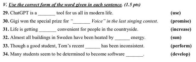 Phần 4 (4,0 điểm): Từ câu 29 đến 40, gồm viết dạng đúng của từ; viết cụm từ phù hợp theo thông tin cho sẵn; viết câu
