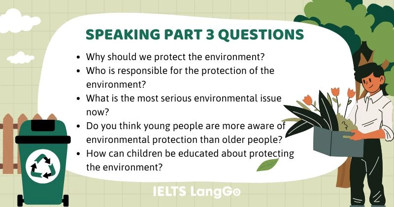 Đến với Part 3, các câu hỏi thường cũng sẽ liên quan đến chủ đề về Environment (môi trường) - một chủ đề khá rộng nhưng cũng rất quen thuộc. Các bạn hãy nhớ ngoài việc đưa ra quan điểm chính cho câu trả lời thì bạn còn cần đưa ra các luận điểm hỗ trợ cho chúng nữa nhé.