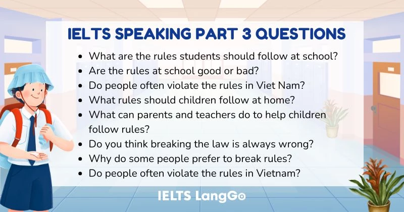 Với đề bài Describe a rule that you don’t like các câu hỏi cho Part 3 thường cũng sẽ liên quan đến chủ đề “Rules and regulations” - một chủ đề tương đối lạ lẫm và hiếm gặp với đa số các bạn thí sinh.