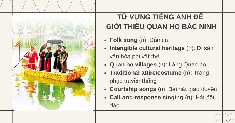 Dưới đây là các từ vựng và cụm từ tiếng Anh hữu ích để giới thiệu về Quan họ Bắc Ninh kèm ví dụ: