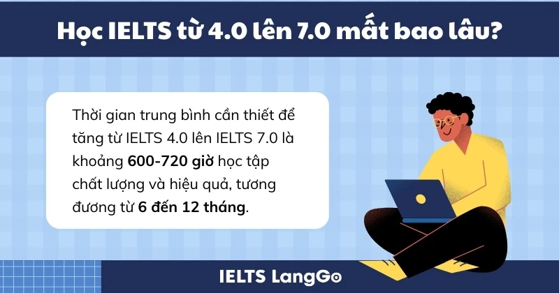 Theo thống kê từ IDP và British Council, thời gian trung bình cần thiết để tăng từ IELTS 4.0 lên IELTS 7.0 là khoảng 600-720 giờ học tập tập trung và hiệu quả, tương đương từ 6 đến 12 tháng, tùy thuộc vào cường độ học tập và khả năng tiếp thu của mỗi cá nhân.