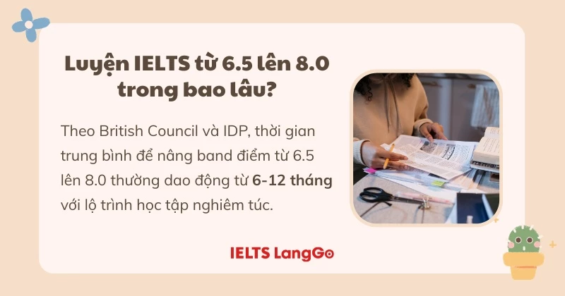 Theo British Council và IDP, thời gian trung bình để nâng band điểm từ 6.5 lên 8.0 thường dao động từ 6-12 tháng với lộ trình học tập nghiêm túc.