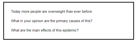 Sau khi xác định vấn đề chính là 'growing number of overweight people', bạn nên tìm 2-3 nguyên nhân và các hệ quả có thể xảy ra. Ví dụ: