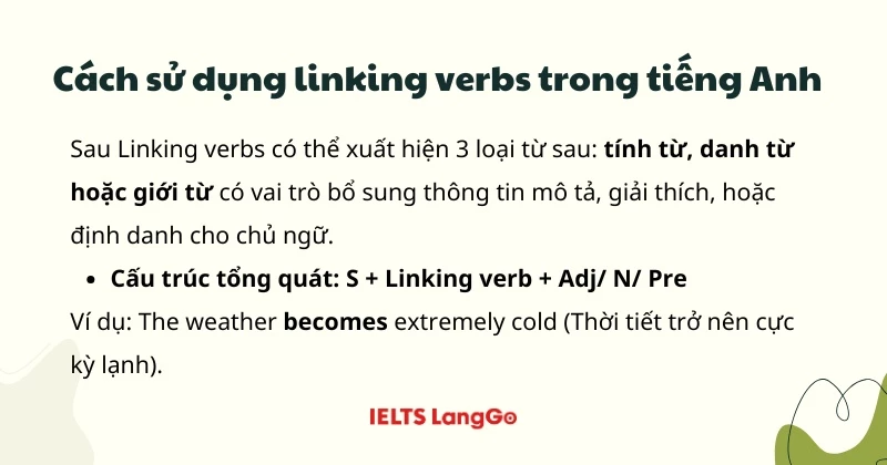 Sau Linking verbs có thể xuất hiện 3 loại từ sau: tính từ, danh từ hoặc giới từ có vai trò bổ sung thông tin mô tả, giải thích, hoặc định danh cho chủ ngữ.