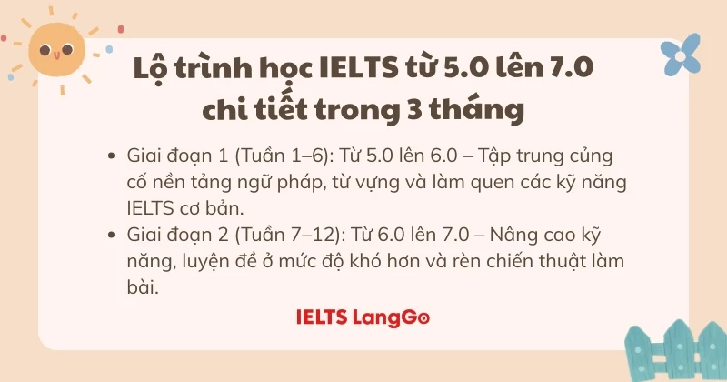 Mục tiêu tăng từ IELTS 5.0 lên 7.0 trong 3 tháng là một thách thức lớn nhưng khả thi nếu bạn có kế hoạch khoa học và quyết tâm. Lộ trình dưới đây chia làm 12 tuần (3 tháng), gồm 2 giai đoạn chính: