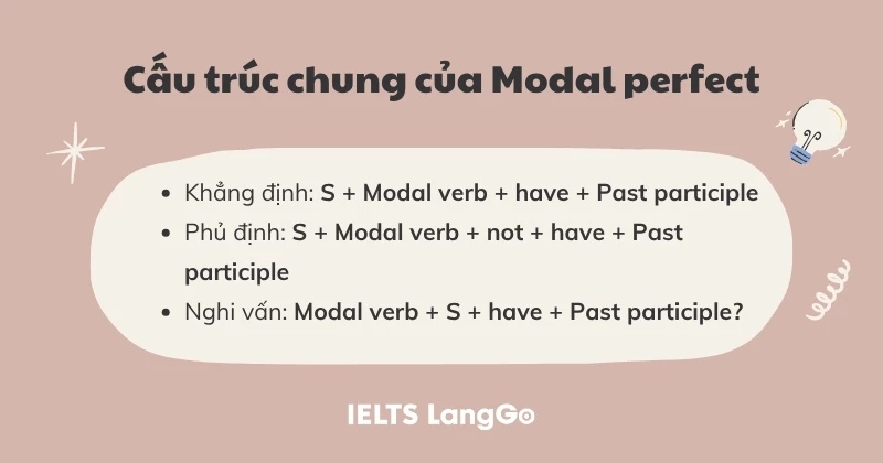 Perfect modal verb được tạo thành bằng cách kết hợp modal verb với "have" và past participle. Sau đây là cấu trúc cơ bản:
