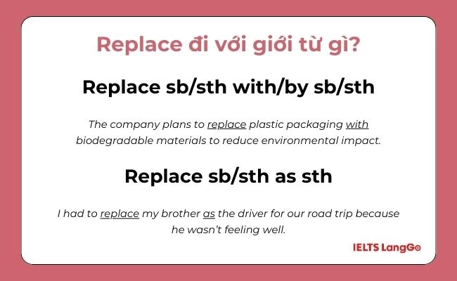Trong Tiếng Anh, Replace đi với 3 giới từ with, by và as để diễn tả hành động thay thế ai, cái gì bằng một người, vật hay vai trò khác.