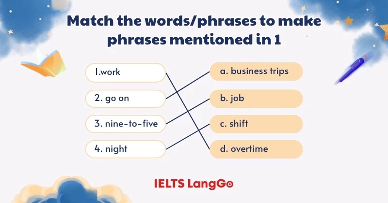 1. work - d. overtime → work overtime (làm thêm giờ)
