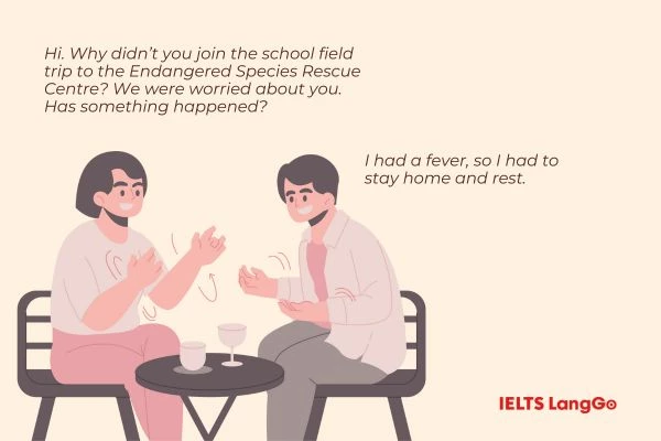 A: Hi, B. Why didn’t you join the school field trip to the Endangered Species Rescue Centre? We were worried about you. Has something happened? (Chào B. Sao bạn không tham gia chuyến đi thực tế của trường đến Trung tâm Cứu hộ Loài có Nguy cơ Tuyệt chủng? Chúng mình đã lo cho bạn. Có chuyện gì xảy ra sao?)