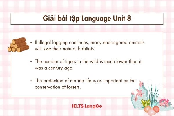 3. We must stop poaching. Otherwise, many endangered species will become extinct. (unless) (Chúng ta phải ngăn chặn việc săn bắn trái phép. Nếu không, nhiều loài có nguy cơ tuyệt chủng sẽ biến mất.)