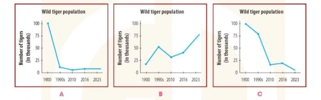 2. Which line graph shows the population of tigers over the past 100 years? (Biểu đồ đường nào thể hiện số lượng hổ trong 100 năm qua?)